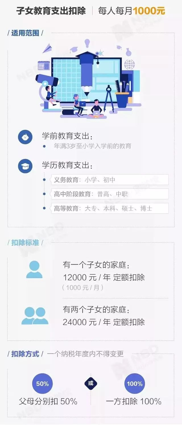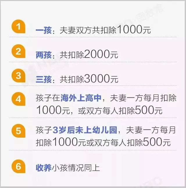 子女从满3周岁至教育结束,不论处在什么教育阶段,不论是在中国境内还是境外接受教育,均可按照每个子女/月扣除1000元,或由夫妻双方每人各扣除500元计算。