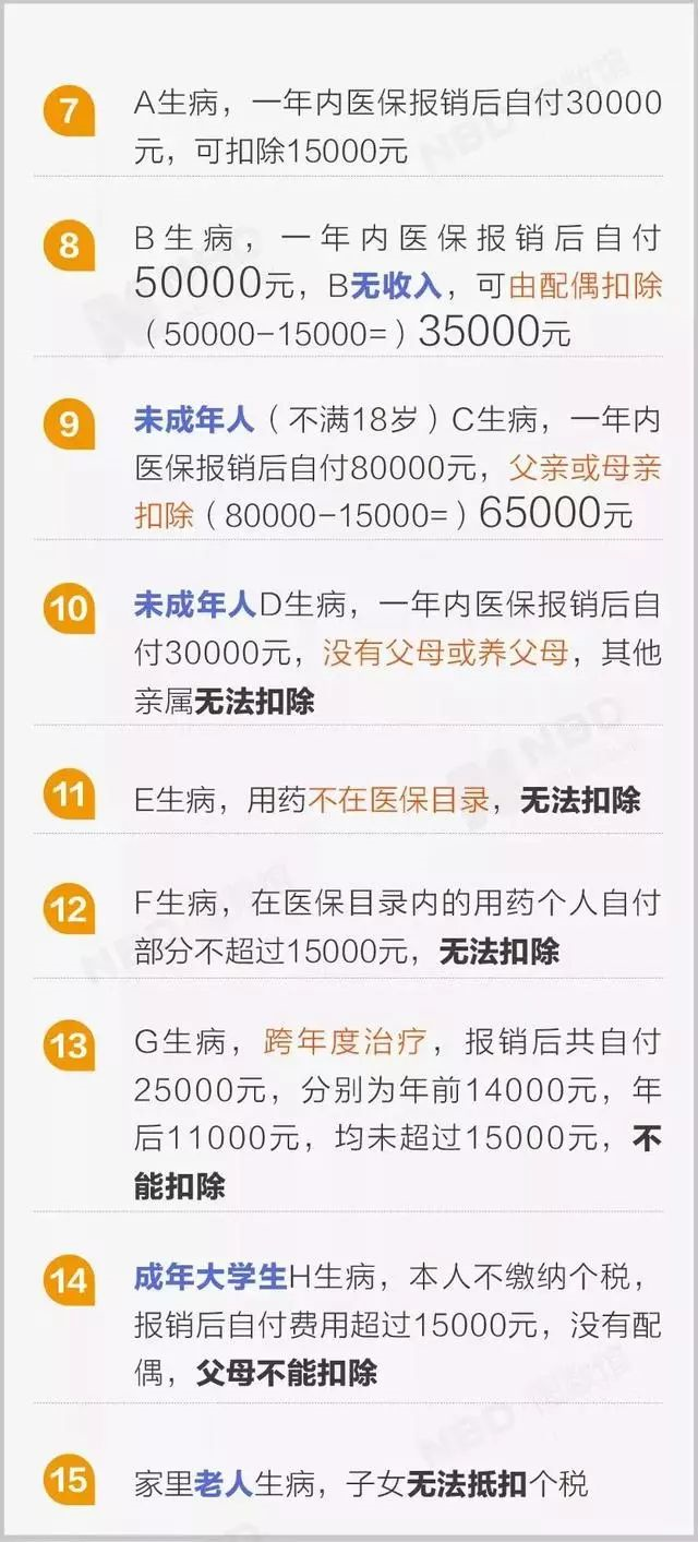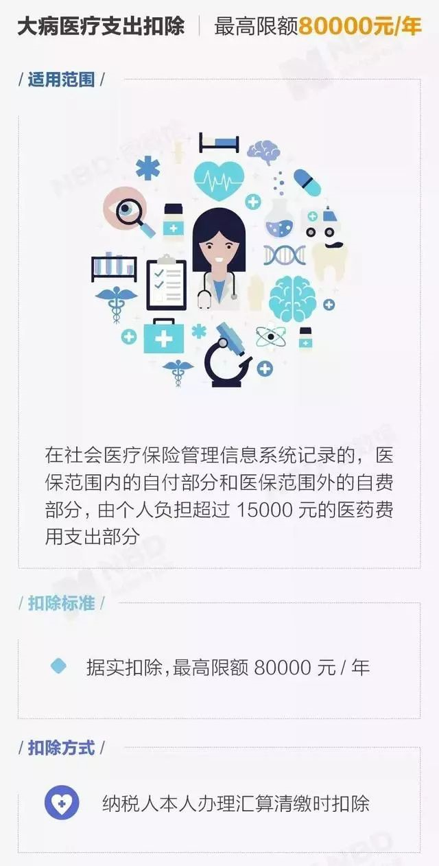 在一个纳税年度,纳税人医保报销后个人负担(医保目录的自付部分)累计超过15000元的部分,在80000元限额内据实扣除。