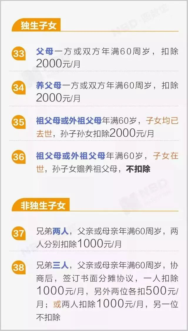纳税人赡养年满60岁父母的支出,或者祖父母、外祖父母的子女已经去世,纳税人赡养年满60岁的祖父母或外祖父母的支出可以扣除。纳税人属于独生子女的,按每月2000元扣除;属于非独生子女的,与其兄弟姐妹分摊每月2000元的扣除额度,其中每人分摊的扣除额度不得超过1000元。