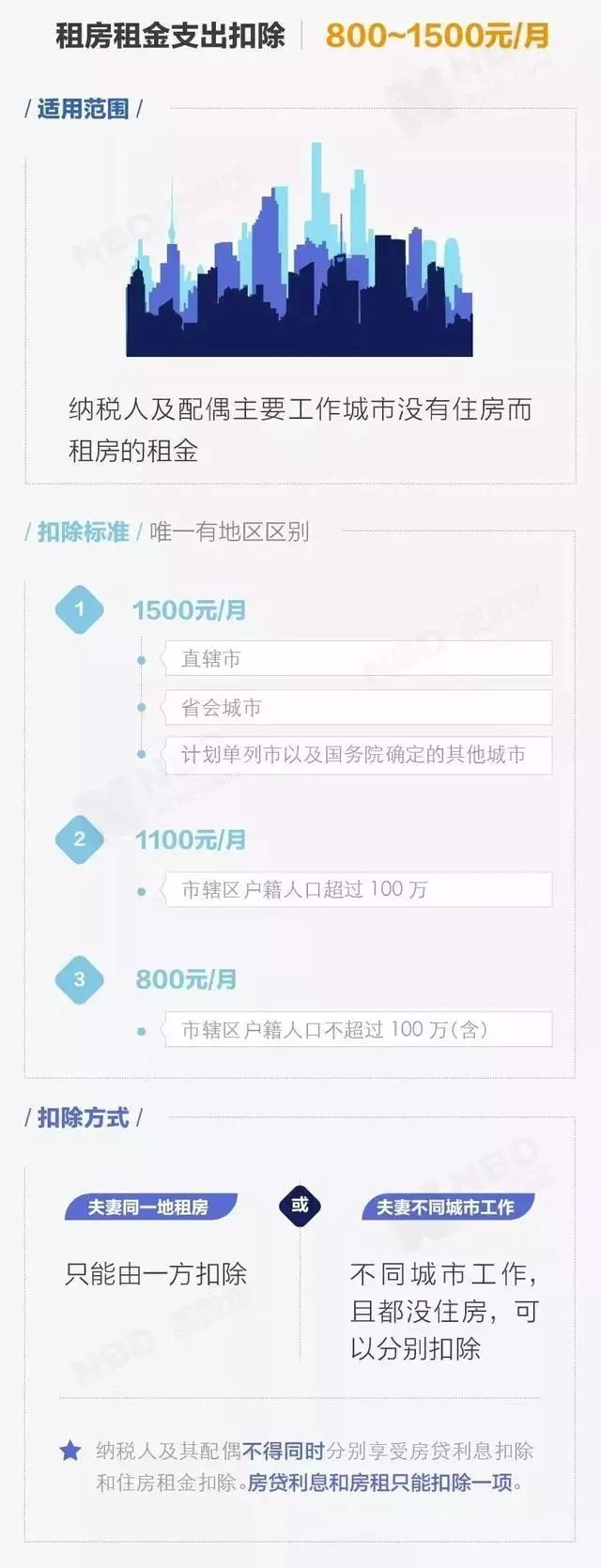 纳税人在主要工作城市没有自有住房而发生的住房租金支出,在直辖市、省会(首府)城市、计划单列市及国务院确定的其他城市的,按每月1500元扣除;除上述城市外,市辖区户籍人口超过100万的城市,按每月1100元扣除;市辖区户籍人口不超过100万的城市,按每月800元扣除。夫妻双方主要工作城市相同的,只能由一方扣除。